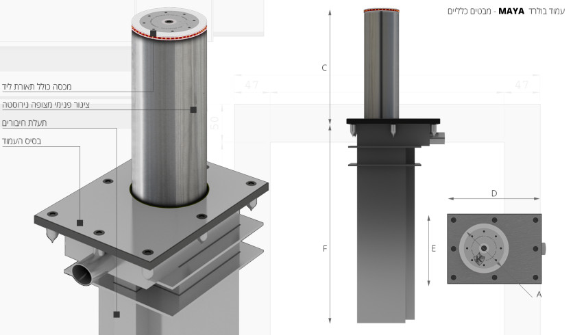 עמוד בולרד MAYA מיוצר לפי סטנדרטים בין לאומיים ומשלב בתוכו מראה אסתטי מודרני עם חוזק ואמינות העבודה ללא הגבלה במספר פתיחות . עמודי בולרד MAYA באים בשני גבהים : 700 ו – 1000 מ”מ בעלי כושר נגיפה : K-4, K-8, K-12 .ניתן לכוונן מהירות עליה וירידה כאשר המהירות המקסימלית לעליה וירידה היא 1.5 שניות .