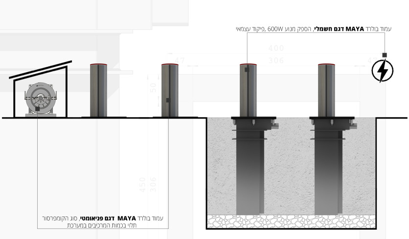 חפיפה כ – 30% לפחות. עמודי בולרד MAYA עשויים לכלול בוכנה עם אופציה לשילוב בקר. ניתן להתקין עמוד בולרד MAYA הן כיחידה עצמאית והן לשלבו עם מערכות נוספות דרך הבקר. ניתן לייצר את המחסום באופן פניאומטי או באופן חשמלי.
