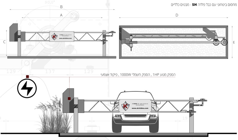 המחסום בא במפתחים בין 2.6 ל 6 מ’. מחסום ביטחוני SH בעל גוף מפח בעובי 10 מ”מ ממולא בטון, כבל פלדה בעובי 20 מ”מ וכושר נגיפה K4. מתאים לשימוש באתרים עם דרישת בטחון גבוהה ביותר. התקנת המחסום קלה ללא צורך ביסוד, המחסום בא על המשטח הקיים.