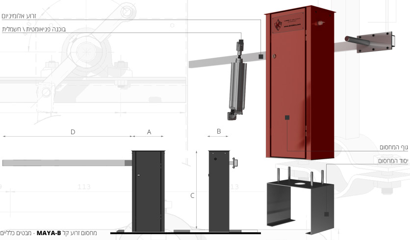מחסום MAYA-B הוא מחסום מסיבי בעל גוף מפח מגולוון עמיד ביותר כולל צבע עליון על פי בחירת הלקוח בכפוף לקטלוג צבעים של חברת א.ב. קידמה בע”מ. המחסום בנוי בצורה נוחה ופשוטה לתפעול. המחסום MAYA-B מגיע יחד עם יסוד קומפקטי מיועד ליציקה שמאפשר התקנת המחסום בשטח מהירה ונוחה.
