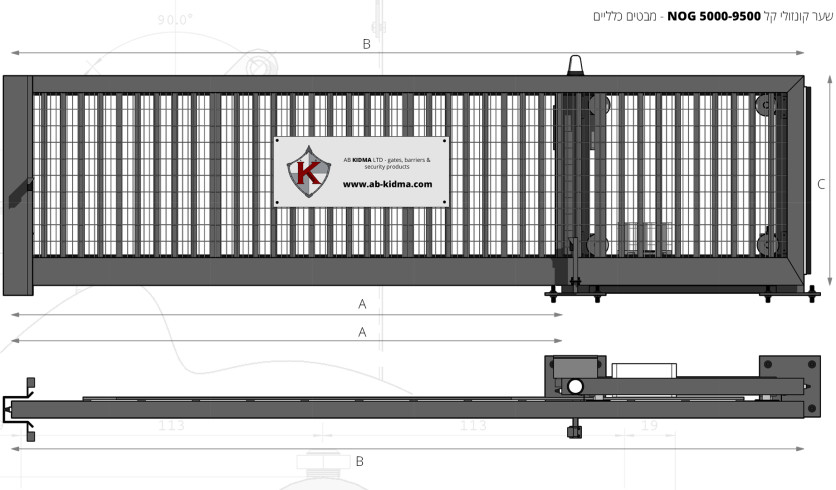 השער בא במפתחים בין 5 ל 9.5 מ’.שער NOG 5000-9500 הוא מסיבי בעל גוף מפרופילי פלדה , עמיד ביותר בתנאי שטח שונים. שער קונזולי קל בא עם צבע עליון על פי בחירת הלקוח בכפוף לקטלוג צבעים של חברת א.ב. קידמה בע”מ.